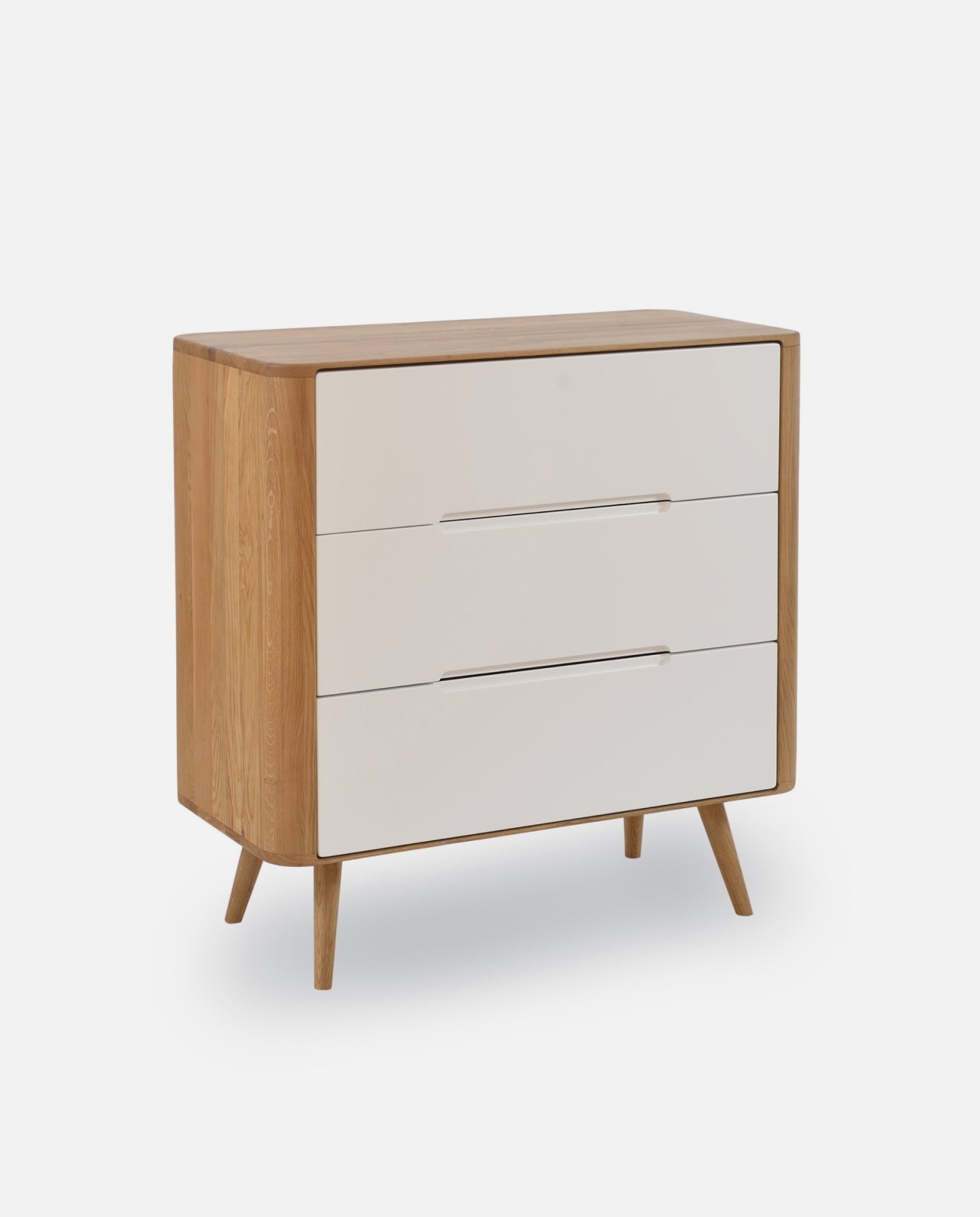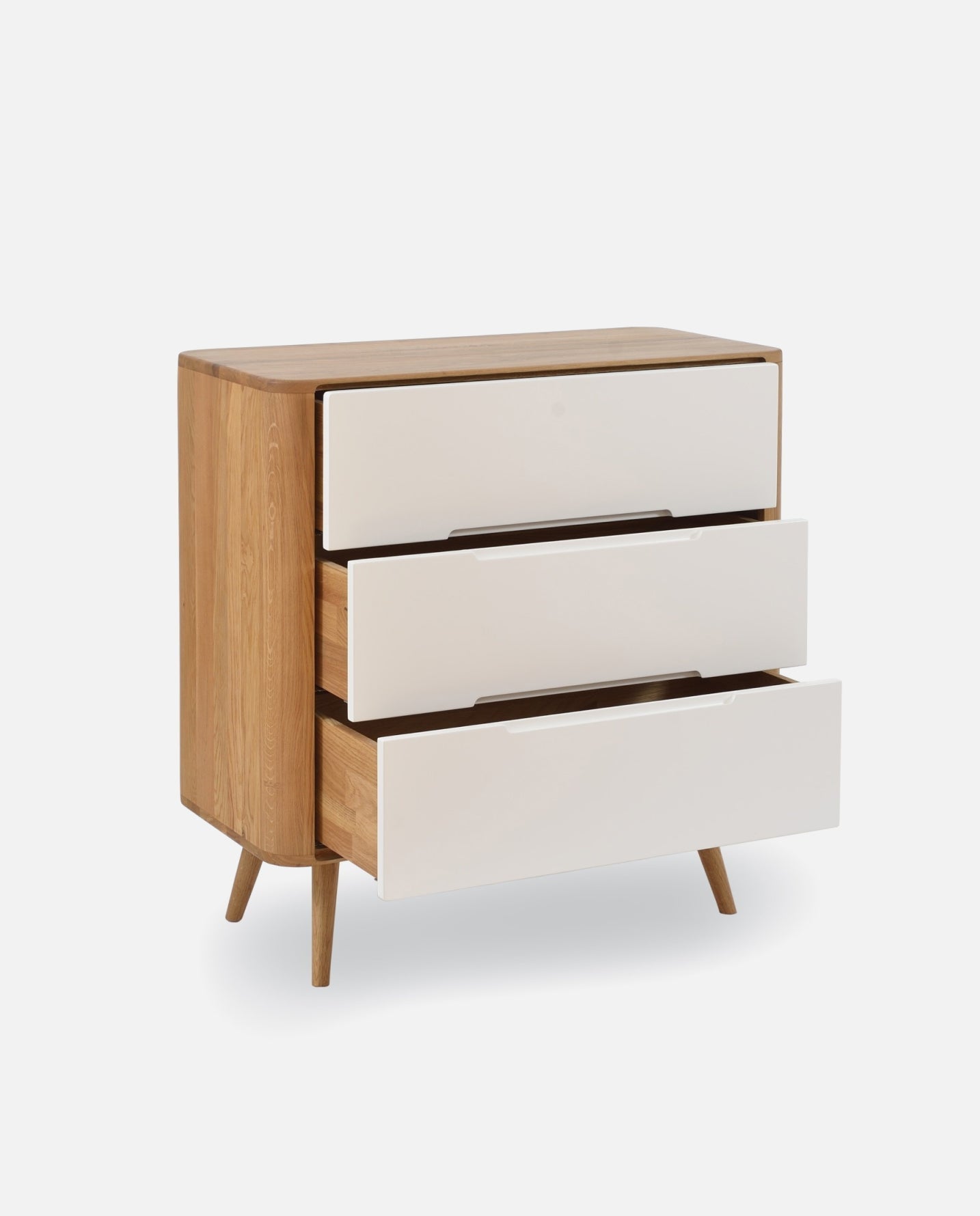 - Tre cassetti spaziosi con apertura fluida e sicurezza anti‑ribaltamento